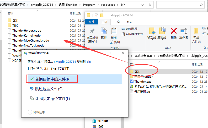 3、an’zhuang’wan’c将下载文件中的SDK整个文件夹复制到迅雷11同目录下(Thunder\Program\resources\bin\SDK),接着将“Thunder.exe”程序复制到(Thunder\Program)目录下进行替换。